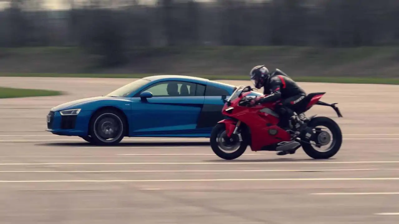 Ducati Panigale V4, İtalyan markanın ilk kez seri üretime koyduğu V4 motosikleti oluyor. 1.103 cc’lik 4 silindirli bir motora sahip olan bu motosiklet 211 beygir güç ve 122 Nm tork üretiyor. Autocar adlı otomobil medyası da bu motosikletin performansını test etmek için, 540 beygir güce ve 540 Nm torka sahip olan Audi R8 ile karşılaştırmaya karar vermiş.