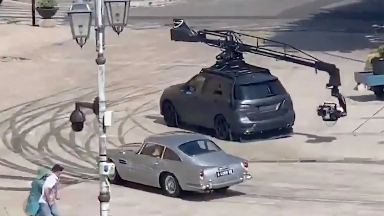 Simsiyah bir Mercedes GLE kamera aracı, bir Aston Martin DB5'i kovalıyor.