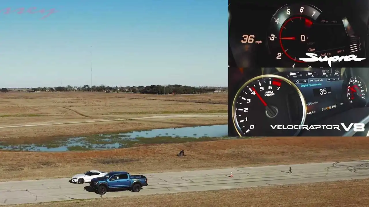 Mavi köşede kendisine güvenen Toyota Supra'yı görüyoruz. BMW kaynaklı 3.0 litrelik turboşarjlı motorundan 340 beygir gücü ve 495 Nm tork üretebilen model, kaputunun altında koca bir V8 bulunduran Velociraptor ile karşı karşıya.