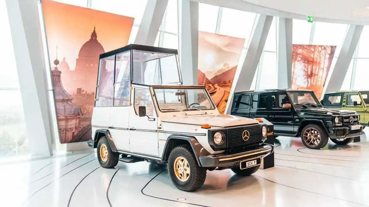 1980 yılında Papa'nın Almanya ziyaretinde Mercedes tarafından hediye edilen bu modifiyeli G-Serisi modeli, Eylül ayına kadar sergide kalacak. Arka kısmı yaklaşık 40 santimetre yükselen aracın bu bölümünde Papa'nın oturabileceği bir cam kutu bulunuyor.