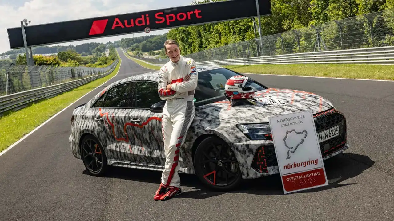 Henüz resmî tanıtımı gerçekleşmediği için kamuflajından arınmaya çekinen RS3, zorlu parkuru 7 dakika 33.12 saniyede tamamladı. Direksiyonda Frank Stippler ve jantların etrafında Pirelli P Zero Trofeo R lastikler bulunuyordu. Dört kapılı cep roketi, karbon seramik frenlere, daha sert bir RS adaptif süspansiyona ve iyileştirilmiş bir şasiye sahip.