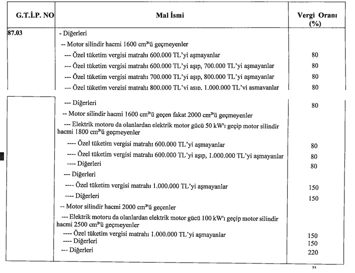 Bu yasa tasarısına göre matrahı motor silindir hacmi 1600 cm3'ü geçmeyen modellerde matrahı 600.000 TL'yi aşmayanlar yüzde 80 dilimine girecek. Bununla birlikte matrahı 1.000.000 TL'yi aşan modellerin de yüzde 80'lik dilimde olduğu görülebiliyor. Bu oranlar ilerleyen dönemlerde değişebilir.