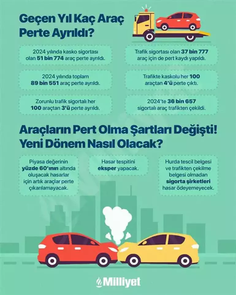 2024 yılında kasko sigortası olan 51 bin 774 araç, trafik sigortası olan 37 bin 777 araç perte çıkarılmıştı. Bir başka deyişle kaskolu her 100 araçtan 4’ü, zorunlu trafik sigortalı her 100 araçtan 3’ü perte çıktı. Genellikle düşük bedelli araçlar bir kazaya karıştığında maddi tazminat tutarı yüksekse sigorta şirketi aracı perte çıkarmayı tercih edebiliyor ya da sürücü "kaza yaptım, araçtan soğudum, artık kullanmak istemiyorum" dediği zaman sigorta şirketi müşteriyi kaybetmemek için aracı perte ayırabiliyordu.