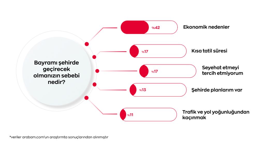 Araştırmaya göre bayramı şehirde geçirmeyi tercih edenlere sebebi sorulduğunda ise katılımcıların %42’si ekonomik koşulları, %17’si tatilin kısa olmasını, %17’si seyahat etmeyi tercih etmediğini, %13’ü şehirde planları olduğunu ve %11’i de bayram trafiği ve yoğunluğundan kaçınmak istediğini ifade ediyor.
